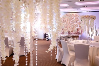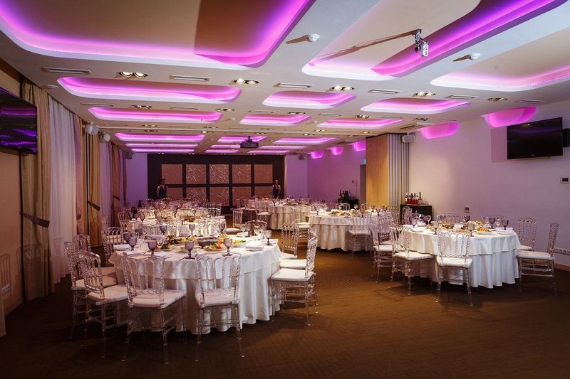 Просторный зал со стильной подсветкой стен и потолка оформлен в нейтральной цветовой гамме. Такой дизайн позволяет придавать банкетному залу тот облик, который требует концепция праздника.