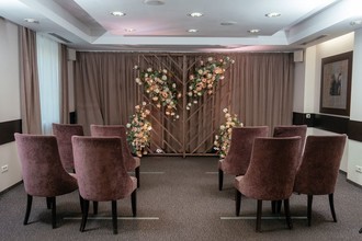 Современная площадка для красивых событий. Лаконичный интерьер не будет перетягивать на себя внимание и позволит оформить площадку по вашему вкусу. Можно организовать выездную регистрацию или приветственный фуршет.