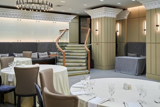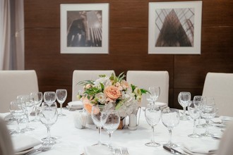 Лаконичный интерьер позволяет оформить зал под праздник любой концепции. Перед рестораном расположены стильные пребарная и мягкая зоны, которые можно использовать для фуршета или фотозоны.