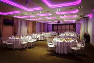 Стильный банкетный зал отличается особой элегантностью и аристократичностью. Современный интерьер выполнен в спокойных теплых тонах. Площадка оснащена подсветкой, которая встроена в стены и может менять цвет в течении всего мероприятия.