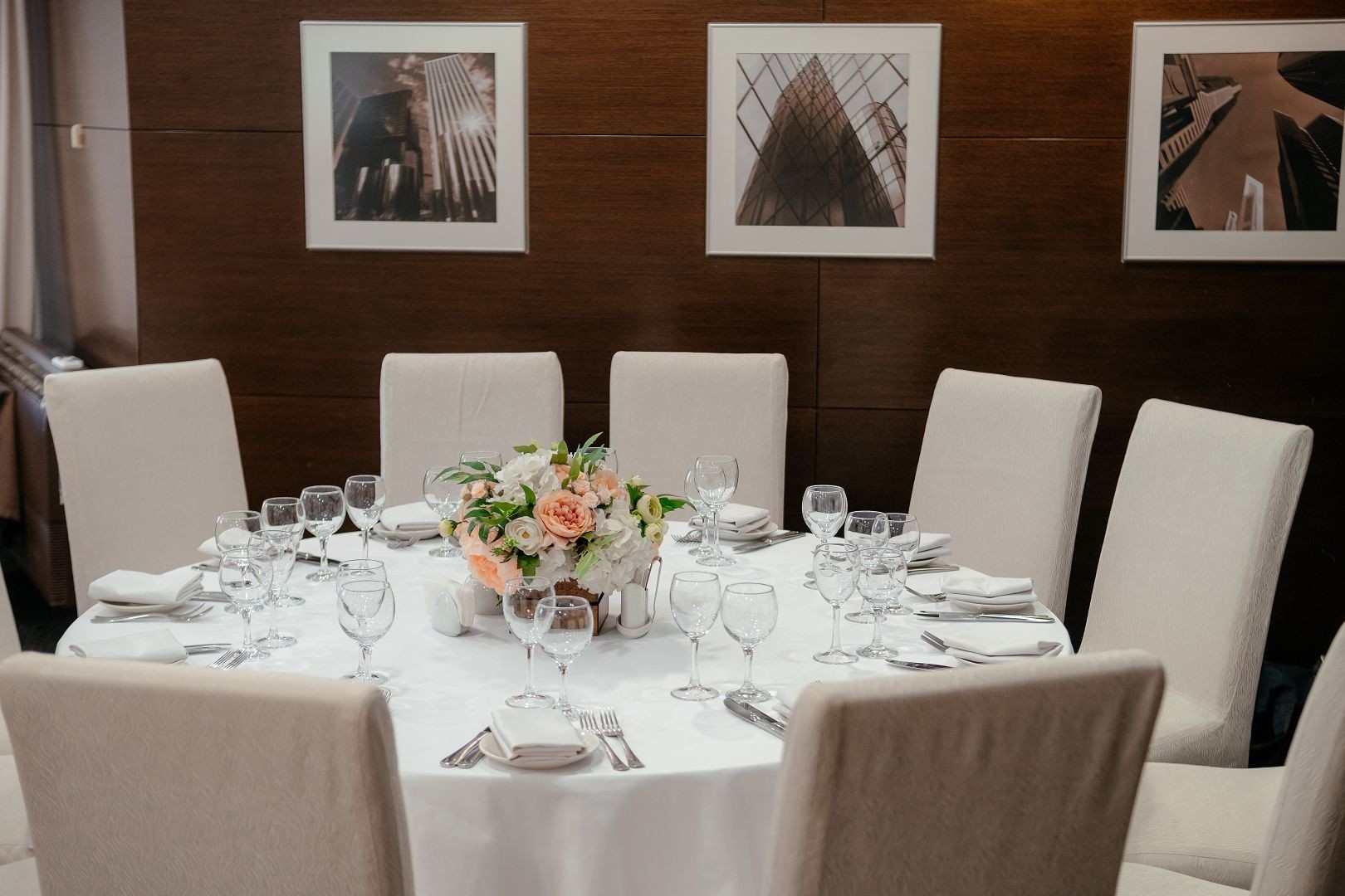 Стильный, вместительный и уютный банкетный зал с минималистичным изысканным интерьером. Подходит для проведения любых торжеств.