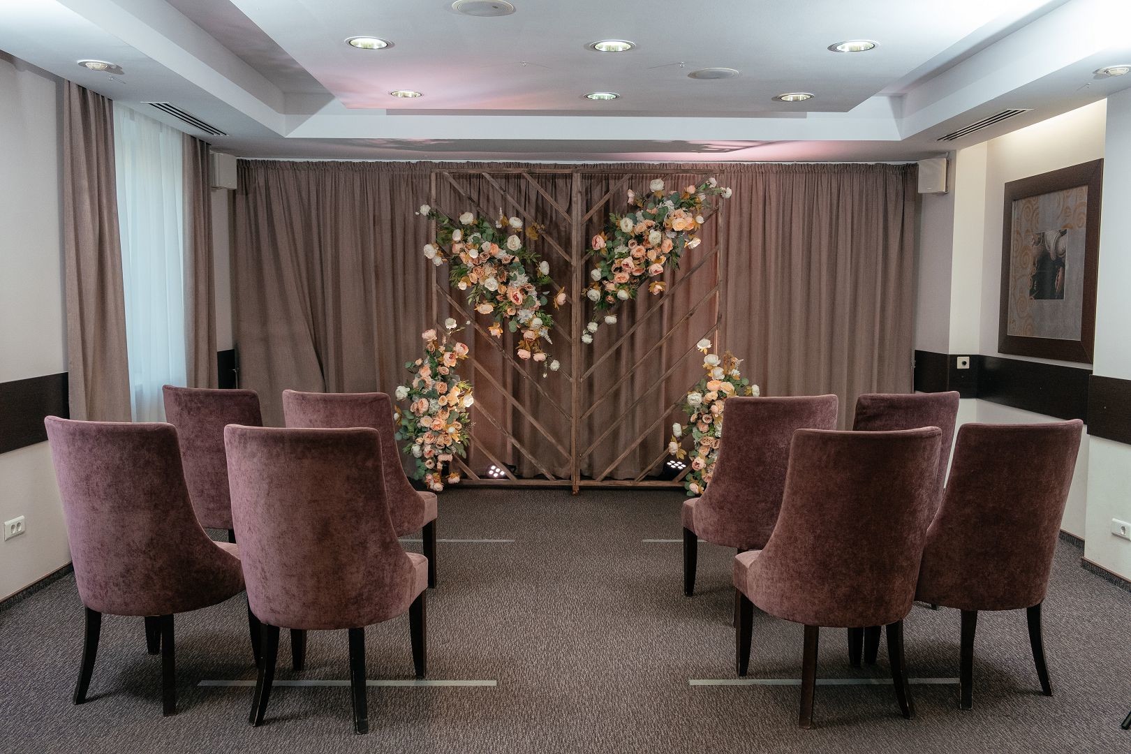 Стильный банкетный зал отличается особой элегантностью и аристократичностью. Современный интерьер выполнен в спокойных теплых тонах. Площадка оснащена подсветкой, которая встроена в стены и может менять цвет в течении всего мероприятия.